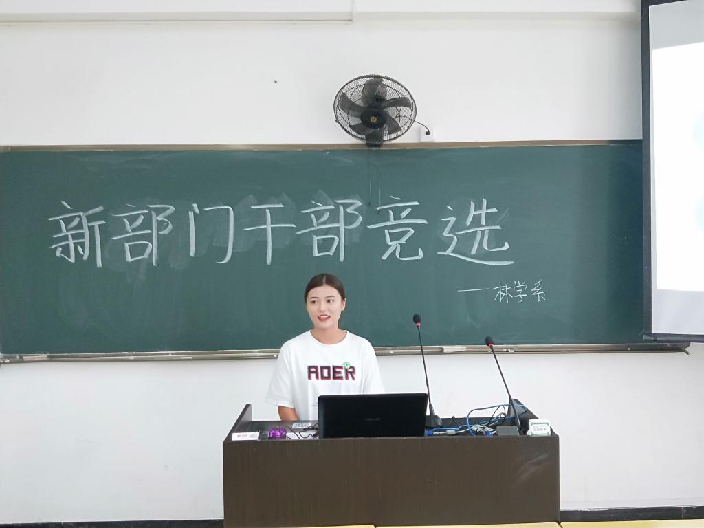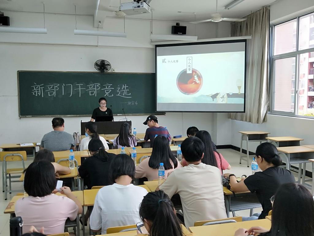 下午4点,竞选演讲正式开始。每位竞选者依次走上演讲台,就自身基本情况、对部门的认识、竞选的原因以及未来发展等进行了演讲,他们有的语言流畅,仪态大方;有的畅谈自己的特长;有的展示自身丰富的工作经验;有的幽默风趣,给人印象深刻。他们通过精彩的PPT和出色的演讲,赢得了在座师生热烈的掌声。