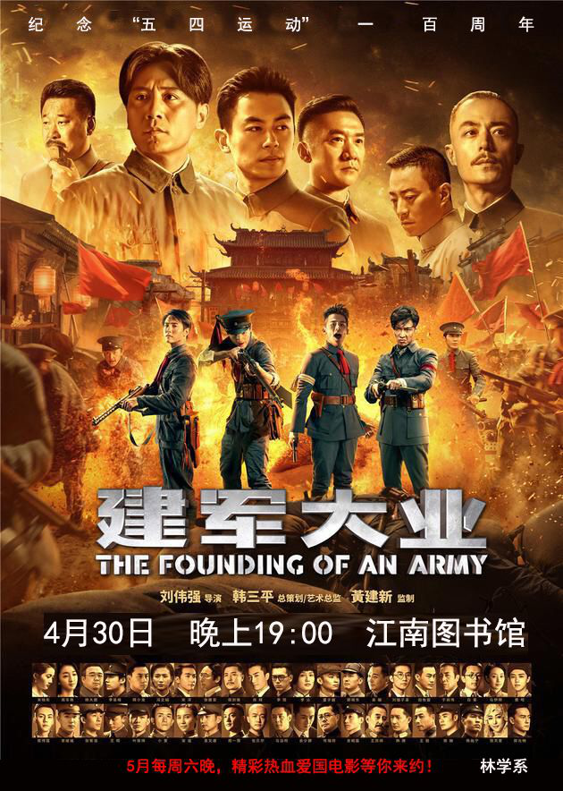 4月30日晚上19点,江南图书馆播放纪念五四运动一百周年主题电影:《建军大业》,影片讲述了1927年第一次国内革命战争失败后,中国共产党挽救革命,于当年8月1日在江西南昌举行武装起义,从而创建中国共产党领导的人民军队的故事,让广大师生更加了解铁血铸军魂,舍己保家国的先辈与他们的奉献。