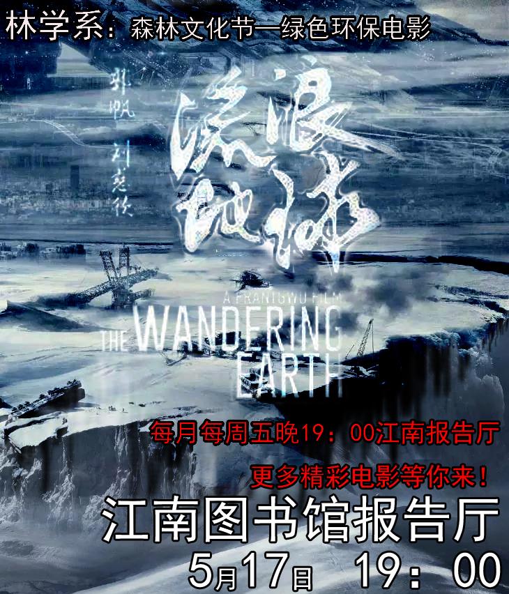 5月17号晚上19点森林文化节绿色文化环保主题电影:《流浪地球》,影片讲述了太阳即将毁灭,人类在地球表面建造出巨大的推进器,寻找新家园,然而宇宙之路危机四伏,为了拯救地球,为了人类能在漫长的2500年后抵达新的家园,流浪地球时代的年轻人挺身而出,展开争分夺秒生死之战的故事。影片呼吁师生要爱护环境,保护环境,我们的家园只有一个,地球只有一个。