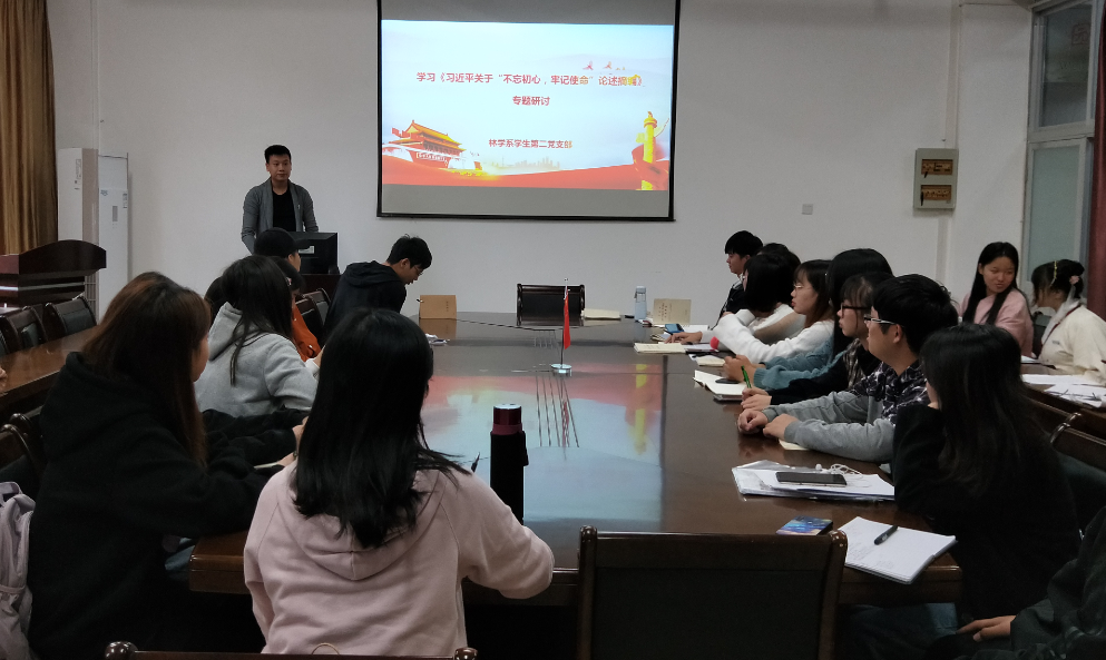 为贯彻“不忘初心、牢记使命”主题教育精神,深入学习习近平新时代中国特色社会主义思想,落实“读原著,学原文”。2019年11月24日,我院林学系学生第二党支部于实训一林学系会议室开展“不忘初心、牢记使命”主题研讨会,深入学习《习近平关于“不忘初心、牢记使命”论述摘编”》,此次会议由林学系学生第二党支部书记陈明峰主持,参会人员为林学系学生第二党支部全体党员和积极分子。