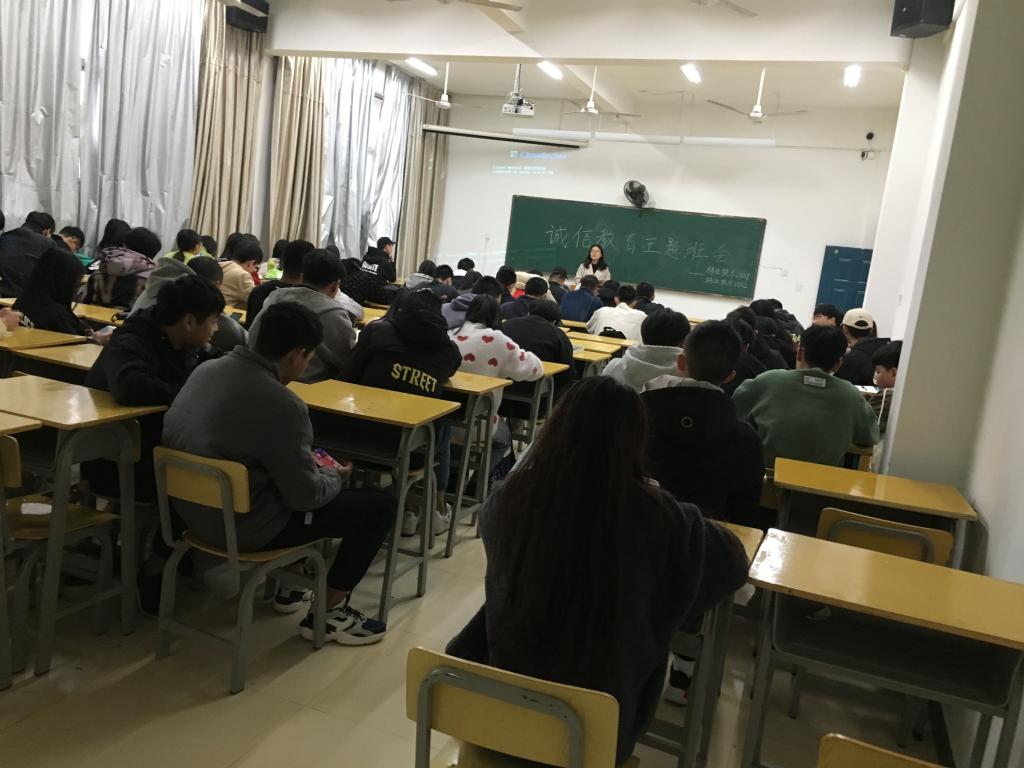 班会依始,各班辅导员以“诚信教育”为主题召开班会。随后,各班观看本次主题“大学生应诚实守信”视频,更好地了解如何做一名诚实守信的大学生。同学们根据视频的内容进行了热烈的讨论,并认识到“以诚实守信为荣,以见利忘义为耻”的守则信条。有些同学结合生活实际阐述自己对诚信的理解,各班对诚信主题展开讨论。除此之外,同学们还共同探讨了诚信考试的话题。坚定牢记要在今后的学习生活中,处处做到诚信,为将来的人生道路打下坚实的基础。