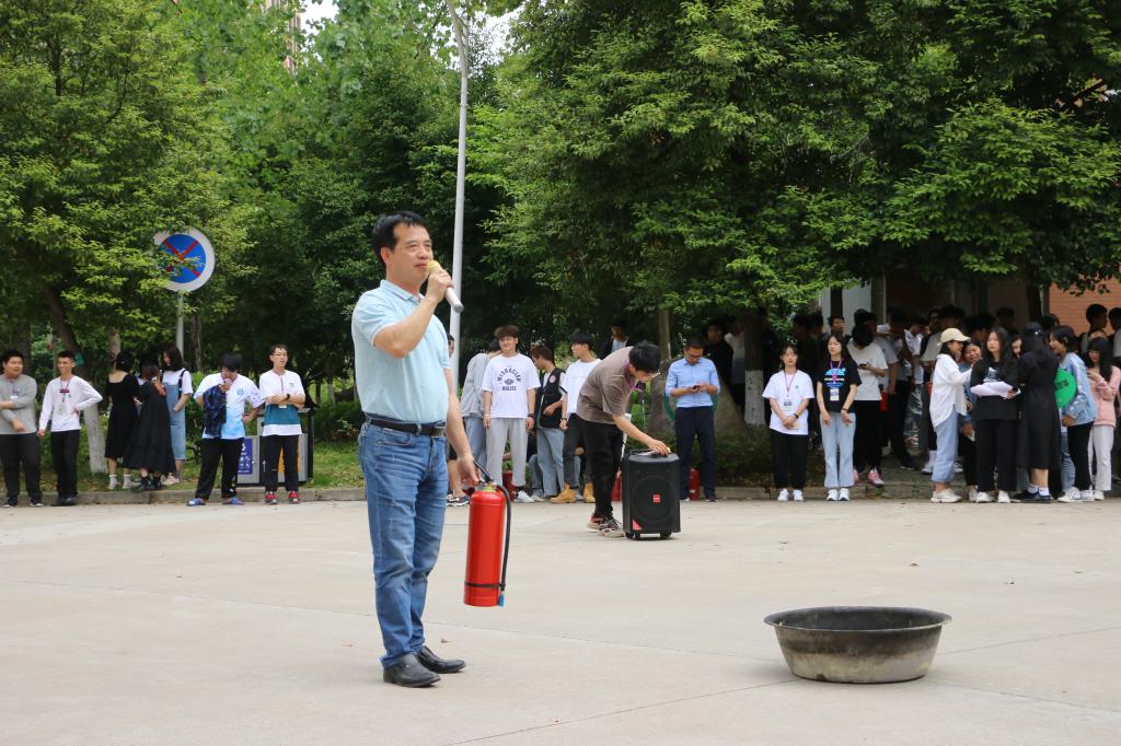 最后,工作人员又组织全体同学到实训四大厅前,学习灭火器的使用方法。