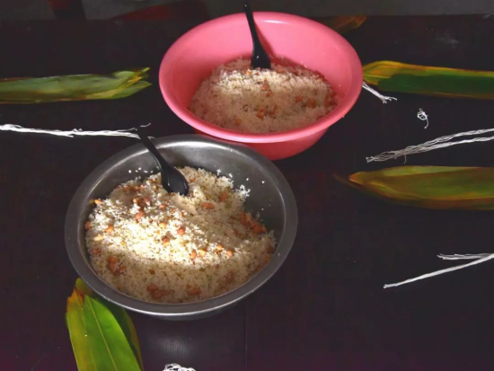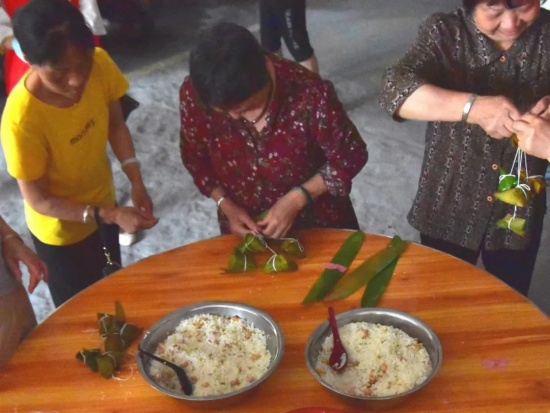 “小林员”们协助社区布置活动现场,并将准备好的糯米、粽叶等整齐地摆放在桌子上,以确保活动有序顺利开展。