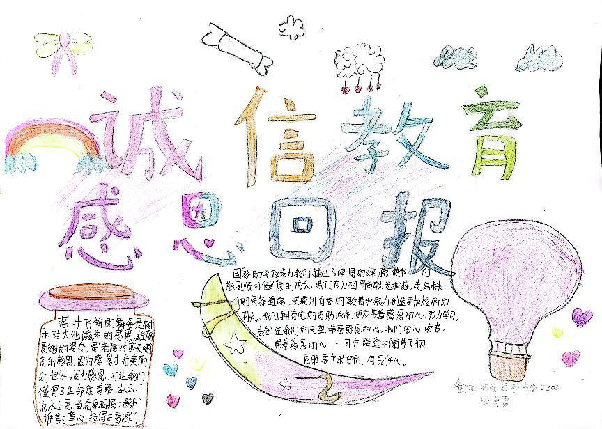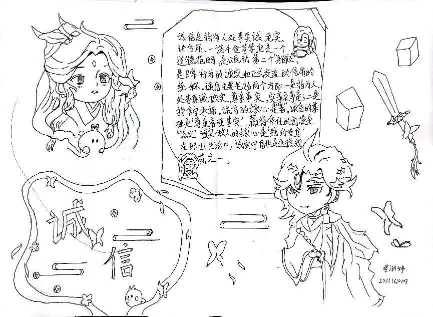 马艳红老师组织食品药品监督管理2201和2202班的同学们开展了诚信手抄报活动。手抄报中同学们抄录了有关“诚信”的名人名言,阐述了诚信的重要性、如何做到诚信,国家资助对贫困同学的帮助,也表达了同学们对国家资助政策的感恩。