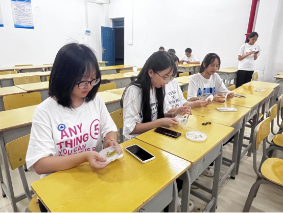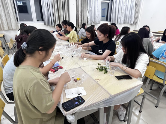 同学们带上手套开始调制胶水的比例3;1,然后搅拌成无气泡无絮状物,将调配好的滴胶倒入模具中,然后放上自己喜欢的干花,摆放整齐,最后把剩下的液体进行封顶,放置好。