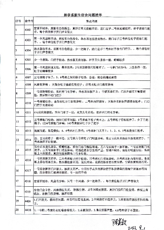 为落实落细学院第一次学生工作会议精神,切实做好林学系2023级新生入学及教育引导工作,帮助新生更好的适应大学校园生活,养成良好的习惯,扣好大学的第一粒“扣子”。林学系党总支积极响应,于8月31日分别召开林学系党总支迎新工作会、林学系2023-2024学年第一学期第二次学生工作会、2023级新生助导培训会等一系列会议,部署安排迎新工作,制定《林学系2023年迎新工作方案》。并在9月1日进行新生宿舍检查,将113间宿舍存在的问题一一列出清单,加盖公章后交给物业公司进行维修,确保迎新工作的顺利进行。