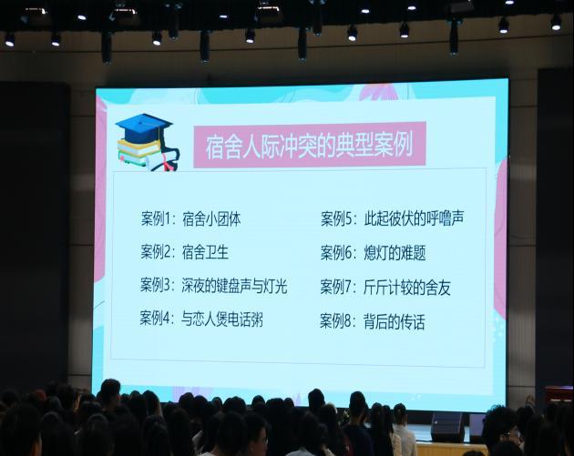 在讲座上,黄韵绣老师例举了一些在宿舍中常发生的矛盾,告诉大家解决这些矛盾的办法,比如借用室友的东西之前一定要礼貌的去告知对方,不能擅自翻动别人的物品,更不要私自翻室友衣柜或者查看电脑和手机,要互相尊重对方的私人空间等等。