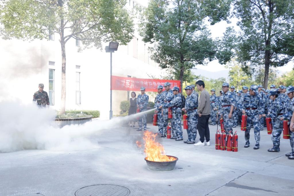 紧急逃生结束后,参训新生前往指定地点进行消防演练。安保处负责老师现场示范如何正确使用灭火器,给新同学们上了一堂实用的安全技能课。通过老师的生动讲解和规范演示,同学们跃跃欲试,沉着面对熊熊烈火,牢记灭火器“:一提,二拔,三握,四压”的使用口诀,站在上风口对准起火根部进行灭火,成功扑灭火焰。