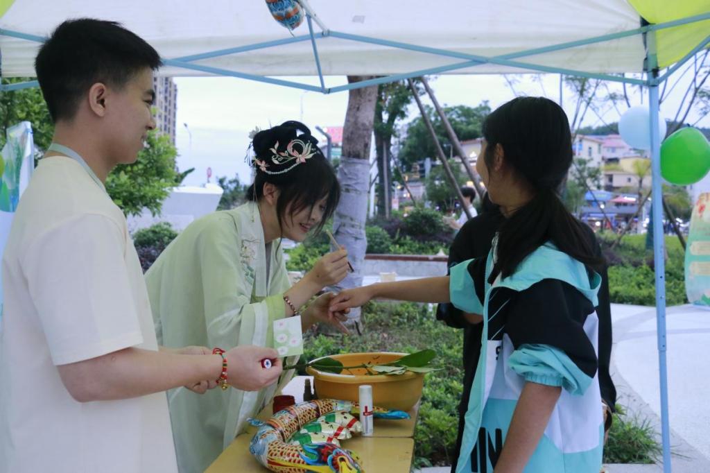 点朱砂:在这个节日里,点朱砂是一项传统的习俗,象征着祈福与平安。这是一种源于中国传统文化的习俗。工作人员用朱砂在参与者手上画一个红点,寓意着祈求平安、驱邪避凶。同学们一起点上朱砂,祈愿平安,事业顺利,健康快乐!