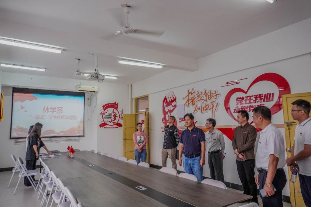 林学系党政领导班子及学生代表对院党委书记陈建辉一行的到来表示热烈欢迎。林学系党总支书记傅成杰就“一站式”学生社区的建设运行情况进行了详细汇报。林学系 “一站式”学生社区自建设以来,始终坚持党建引领,以学生需求为导向,以立德树人为目标,致力于打造具有职教特色和系部特色的学生社区。目前已建成“两区四室”,即“一站式”服务大厅、党团共建中心两个综合区,以及德厚书屋、明思心屋、笃行职屋、业精匠屋四个功能拓展室,满足了学生在学习、心理疏导、就创指导、技能训练等各方面的需求。
