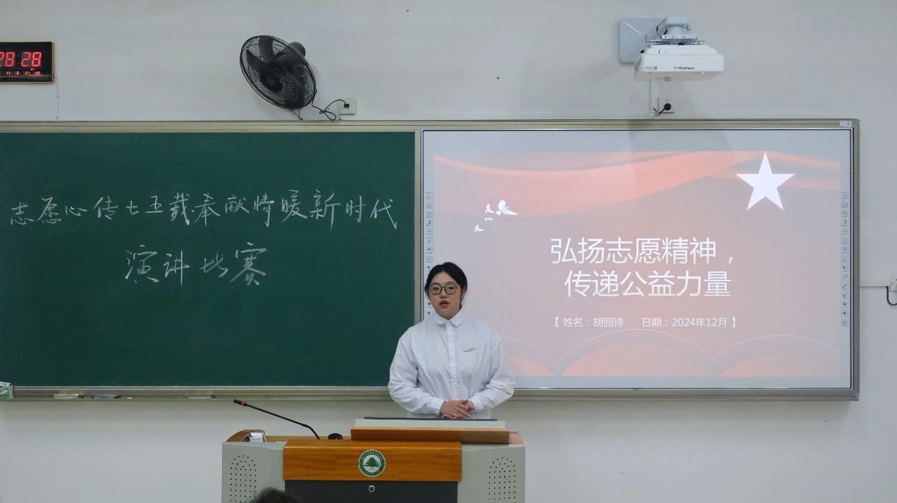 在快节奏的现代生活中,志愿服务作为一种传递爱心、温暖社会的方式,越来越受到人们的重视。为了进一步弘扬志愿服务精神,增强同学们的社会责任感,林学系团总支志愿部于12月8日在教学楼401举办的“志愿心传七五载,奉献情暖新时代” 弘扬志愿者精神演讲比赛圆满落幕。