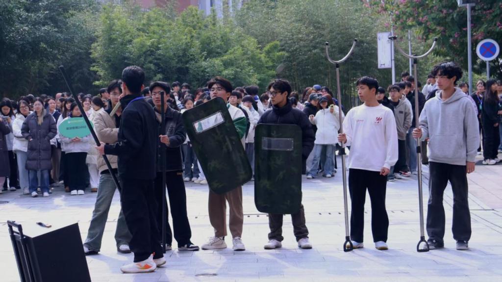 防暴演练环节同样扣人心弦,在图书馆门口模拟场景设定为一名“歹徒”骚扰同学,企图对其造成伤害。工作人员发现情况后,第一时间启动应急响应机制,迅速拿起防暴器械与“歹徒”进行周旋,阻止“歹徒”进一步靠近学生,在工作人员与“歹徒”的激烈对抗下最终成功制服了“歹徒”,解除了危机。
