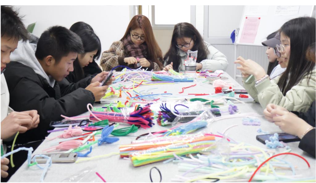活动伊始,同学们纷纷拿出手机,迅速搜索扭扭棒制作教程。认真学习一番后,同学们便围坐在一起,兴致勃勃地开启了扭扭棒工艺品的创作之旅。制作过程中,每一位同学都全神贯注,沉浸在手工创作带来的乐趣之中,只专注于将手中色彩斑斓的扭扭棒,精心塑造成一件件独具匠心的作品 。