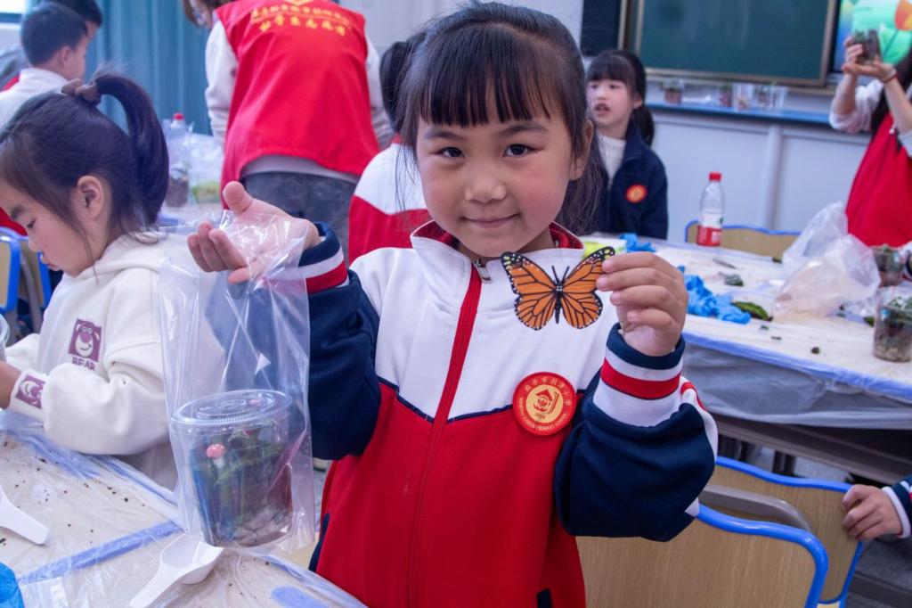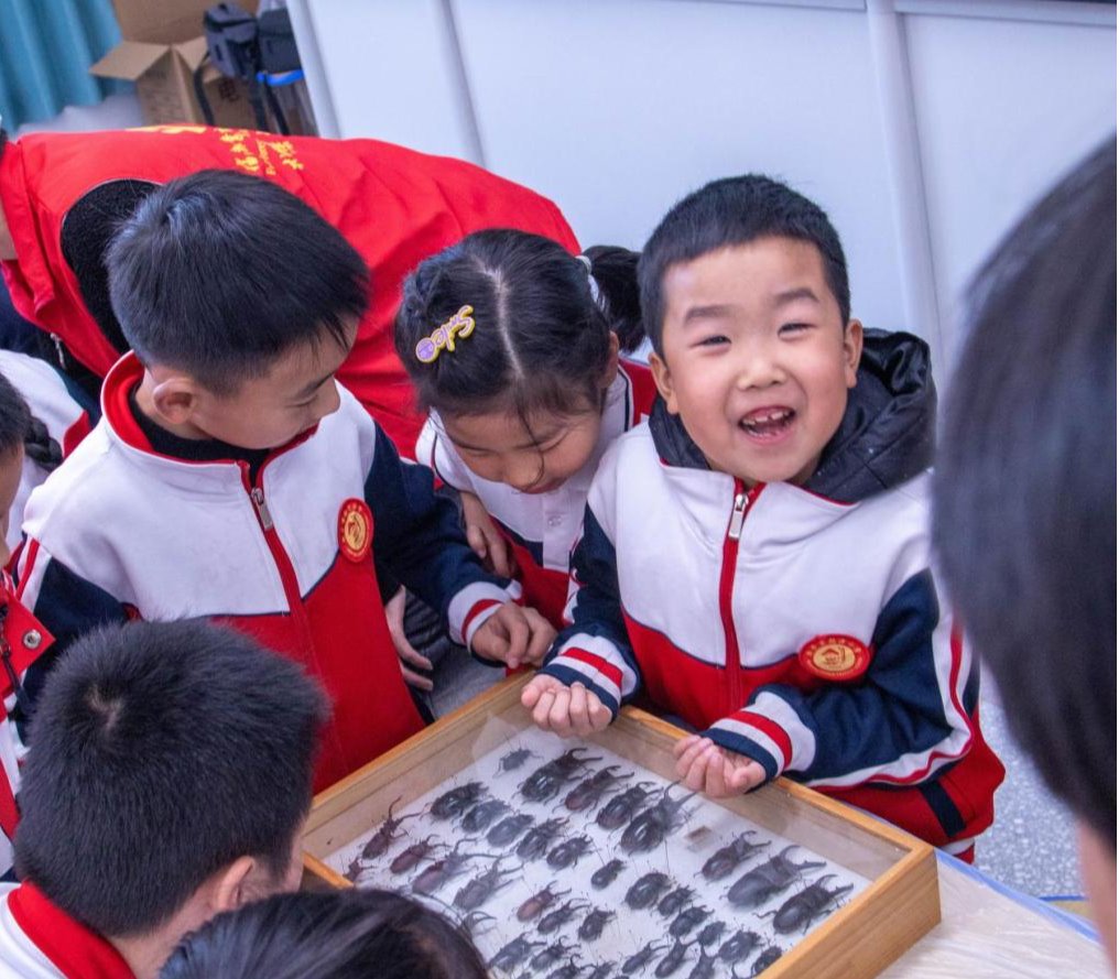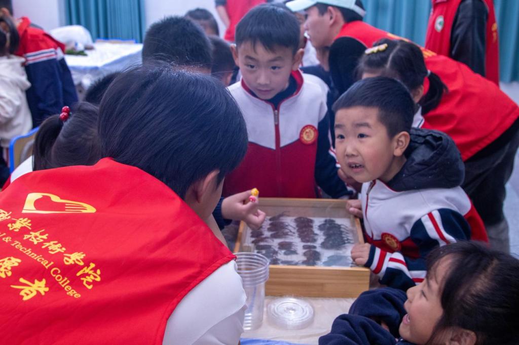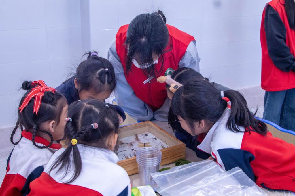 “纸上得来终觉浅,觉知此事要躬行”在志愿者们的引导下,小朋友们细细探寻昆虫标本的微观世界,生动形象地了解到昆虫的结构及功能,掌握昆虫世界的奥秘。当稚嫩的指尖拓印出自然的纹章,知识的经纬度便在童眸中交织成网。