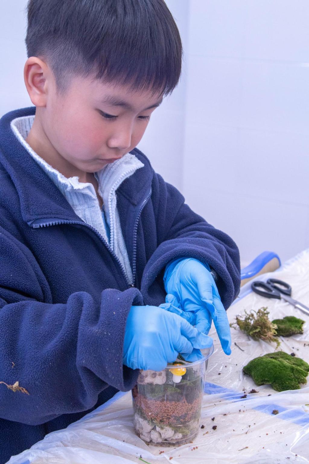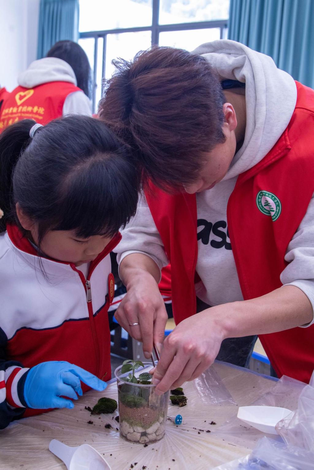 终于迎来最令人期待的制作生态瓶环节。首先由草木缘协会的讲解员以趣味演示揭开微型生态系统的奥秘,介绍了所需材料、制作过程以及注意事项,随后小朋友们便在志愿者们的协助下化身小小生态建筑师,专注地铺陈轻石、安放植株,构建出属于自己的“生态方舟”。制作过程中,不仅能激发小朋友的学习欲望,还能了解到生态文明的理念,更能映照出孩子们眼中跃动的探索光芒。在童心中播撒绿色种子,让校园里萌发文化新芽。