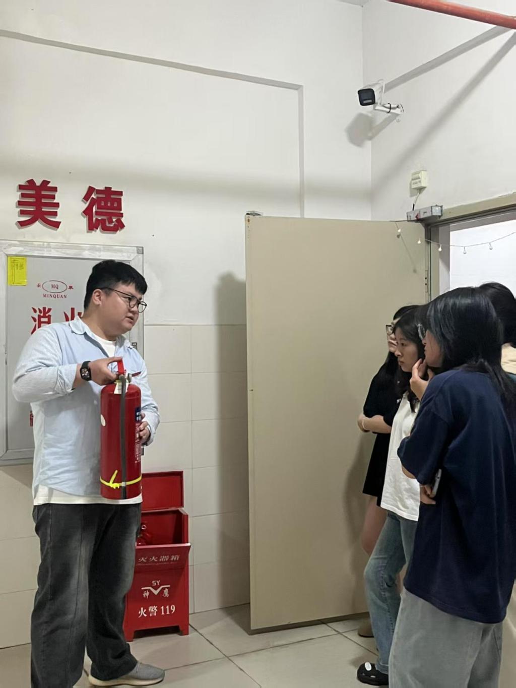 此外,为强化学生消防安全意识,提升应急自救能力,专职辅导员王玮琪老师为同学们讲解了灭火器规范操作方法。并严谨演示如何通过压力指示器判断设备状态、根据火源类型调整喷射距离及站位方向。同学们通过理论与实践相结合,掌握了灭火器实操技能,增强了消防安全意识与应急处突能力,为生命安全筑牢坚实防线。