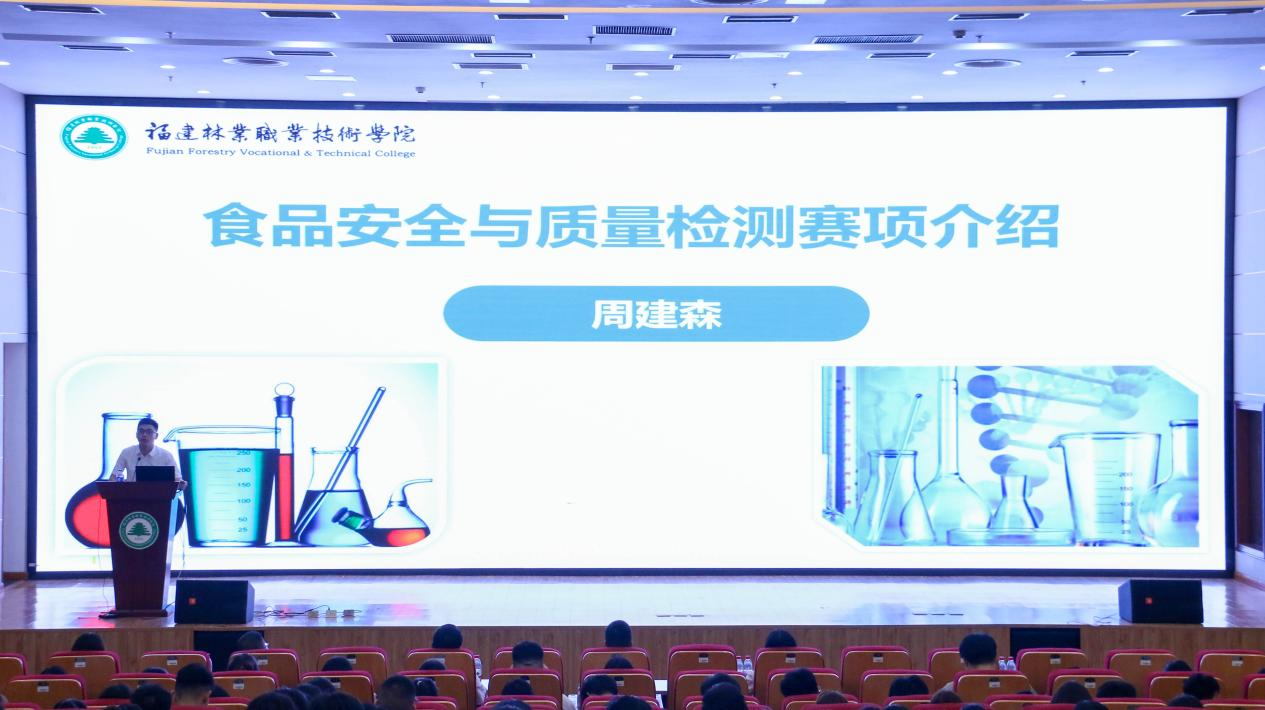 会议第五项议程由八项大赛指导教师进行详细的赛项介绍及动员工作。化学实验技术大赛指导教师兰炜兰老师、食品品质量安全与检测大赛指导教师周建森老师、中华茶艺大赛指导教师巫瑞贞老师、酒店服务大赛指导教师黄汝茜老师、研学旅行大赛指导教师谢行明老师、植物识别大赛指导教师俞群老师、昆虫识别大赛指导教师罗春玉老师(代介绍)、导游服务大赛指导教师罗春玉老师,各位大赛指导教师依次上台为各个赛项进行详细介绍,并鼓励同学积极参与。