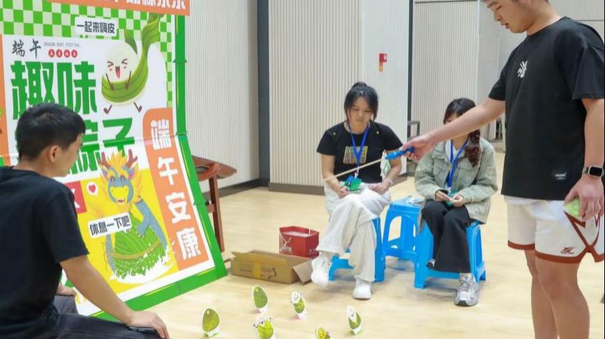 走进游园会现场,欢声笑语不绝于耳。“好运投壶与‘粽’不同”,投壶区里,大家手持箭矢,屏气凝神,瞄准壶口,在传统游戏中感受古人的雅致情趣;“端午射五毒” 处,参与者们张弓搭箭,向着代表 “五毒” 的靶子进发,寓意驱邪祈福;还有 “独乐乐不如粽乐乐” 钩粽子和“端午圈粽你”趣味游戏,大家在轻松愉快的氛围中,尽情享受游戏的乐趣,重拾童年的欢乐。