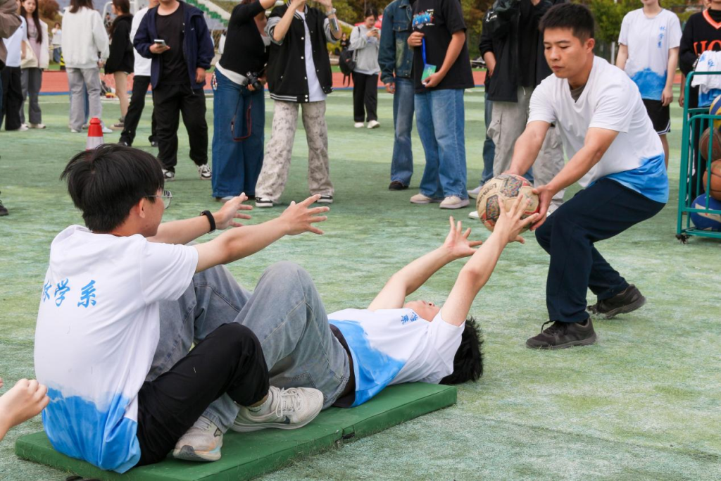 除了竞技项目的热血角逐,趣味赛场同样精彩纷呈。绑腿跑赛道上,林学系的参赛队员们肩并肩、腿绑腿,喊着整齐划一的口号稳步前行。仰卧起坐传球赛场则洋溢着别样的欢乐与紧张。参赛队员们平躺垫上,随着裁判哨声响起,迅速起身、接球、传球,动作连贯利落。