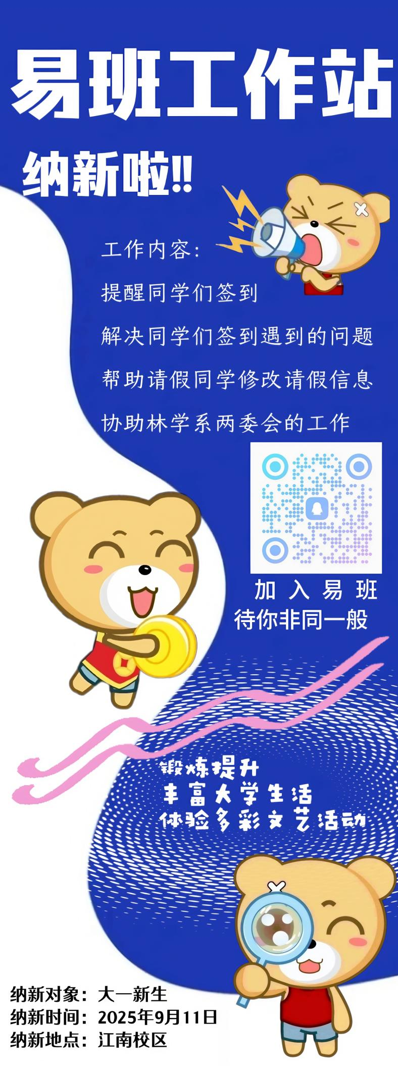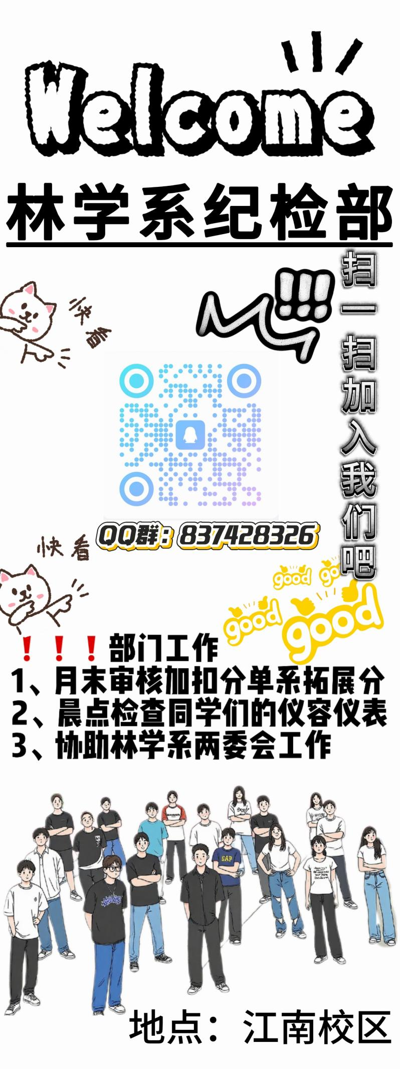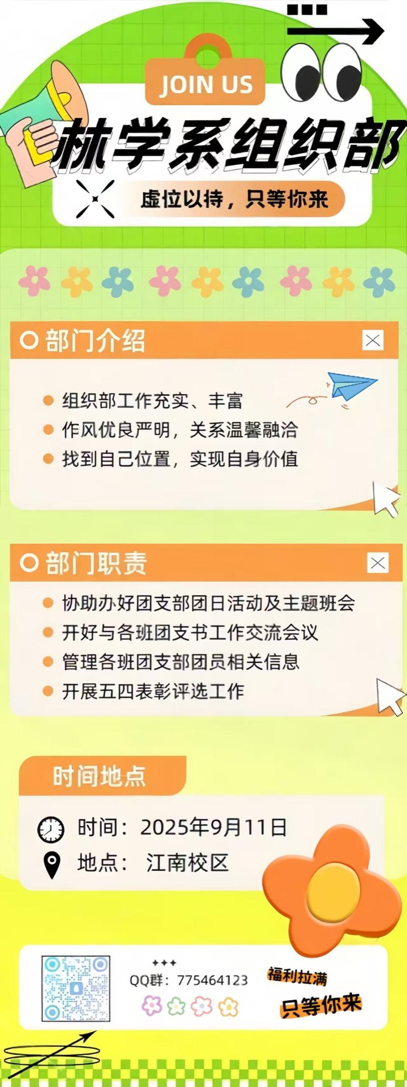 林学系九月藏惊喜,两委会纳新正等你!别让校园时光留白,林学系两委会各部门已就位。这里不只是一个学生组织,更是你校园生活的“加分项”,是你成长路上的“助推器”。别犹豫,趁青春正好,来两委会找到属于你的位置,让校园时光因奋斗而充实,因热爱而闪耀!
