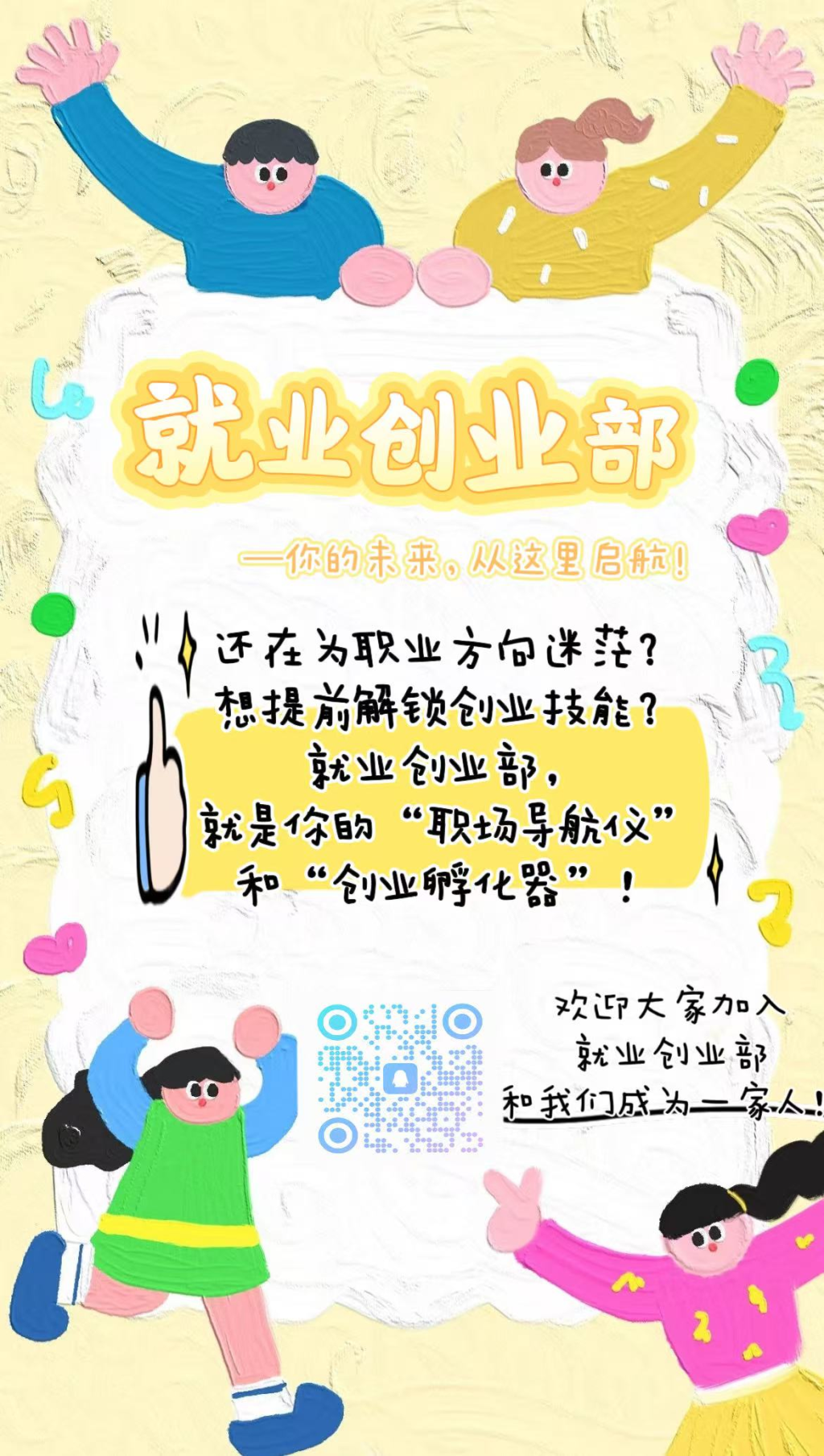 部门介绍:就业创业部是专注于学生职业发展与实践的服务部门,核心目标是为学生就业与创业提供切实支持,同时整合岗位信息、组织创业活动,为学生职业成长保驾护航。