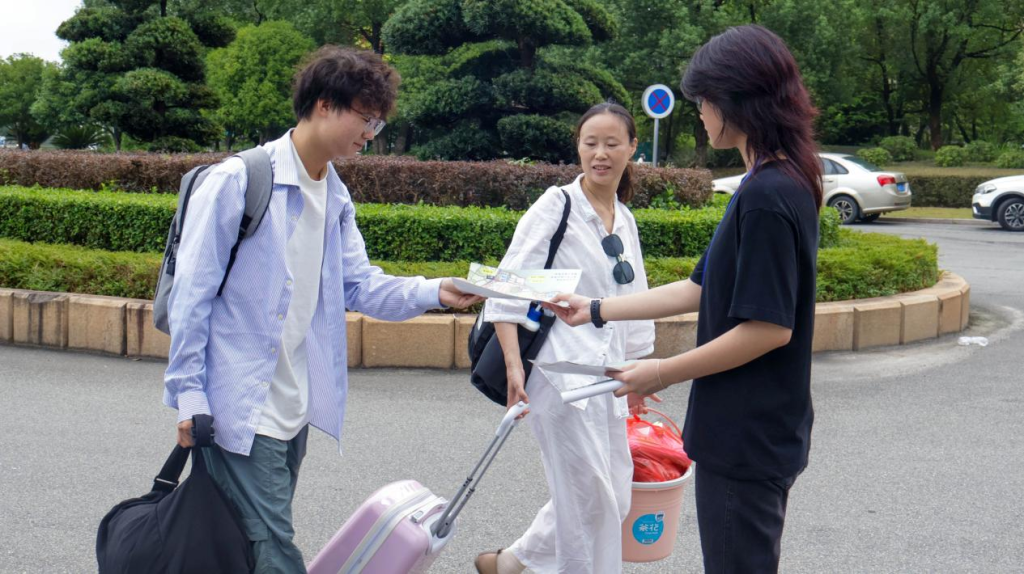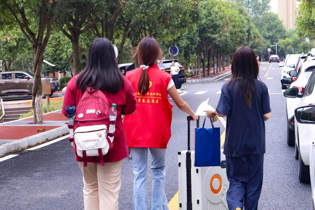 接下来便是萌新们心心念念的宿舍区域了,在宿舍楼下。学姐学长们早已经整装待发,为迎接新生做好充分的准备。他们接过新生的行李,带领着新生们找到将度过三年时光的“小家”。