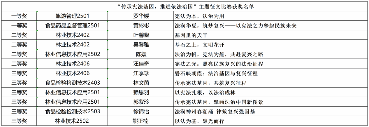 宪法,是治国安邦的总章程,是党和人民意志的集中体现,其精神早已融入民族血脉,成为代代相传的法治基因。为深入学习宣传贯彻习近平法治思想,推动宪法深入人心,让尊法学法守法用法成为社会风尚。林学系办公室于2025年12月1日举办“传承宪法基因,推进依法治国”主题征文活动,此次征文活动吸引了众多写作爱好者踊跃参与。