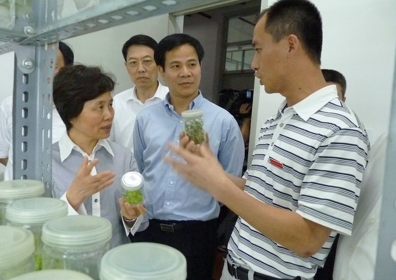 5月22日下午,省委常委、副省长、省委教育工委书记陈桦率领省政府副秘书长李强,省委教育工委副书记、教育厅党组书记、厅长鞠维强,省林业厅党组成员、纪检组长黄文书,省财政厅副巡视员林玉榜,南平市委副书记黄福清,南平市委常委、宣传部部长、市委教育工委书记兰斯文,南平市政府副市长刘亚圣,省政府办公厅教科文处处长李静,省教育厅高教处处长练晓荣,南平市政府副秘书长陈健,南平市教育局局长张文铨等省、市领导到我系植物工厂化育苗基地进行视察,对我系与华能生物有限公司校企合作开展的金线莲组织培养项目表示浓厚兴趣,对校企合作的高职办学模式给予充分赞赏。