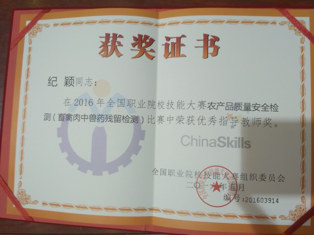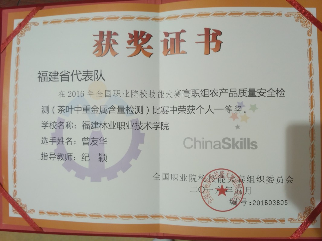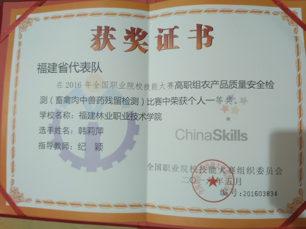 5月23日经过三天紧张的比赛,在2016年全国职业院校技能大赛高职组农产品质量安全检测类三个赛项中:蔬菜中有机磷类农药残留的检测、畜禽中氟喹诺酮类兽药残留的检测、茶叶中重金属含量检测。我院3名同学作为省赛优秀选手代表福建省参加了本次大赛。经过现场操作、第三方检测、上机测量、数据处理等四个环节的激烈角逐,最终曾友华同学获得“茶叶中重金属含量检测”一等奖,韩丽萍同学获得“畜禽中氟喹诺酮类兽药残留的检测”一等奖,邓玉凤同学获得“蔬菜中有机磷类农药残留的检测”二等奖。我院纪颖老师被评为优秀指导教师。