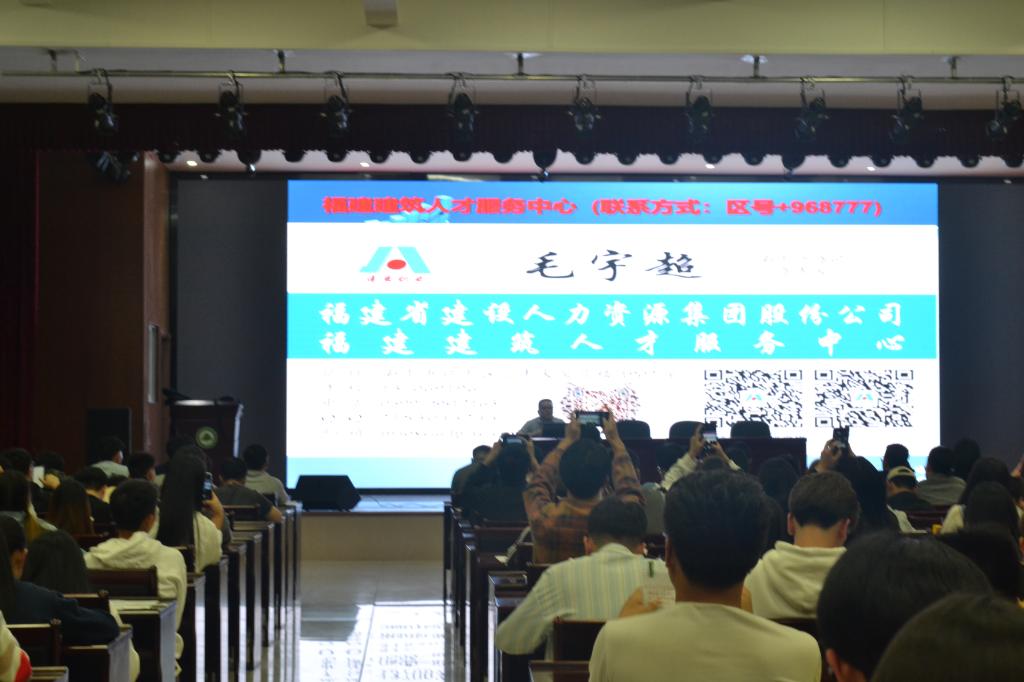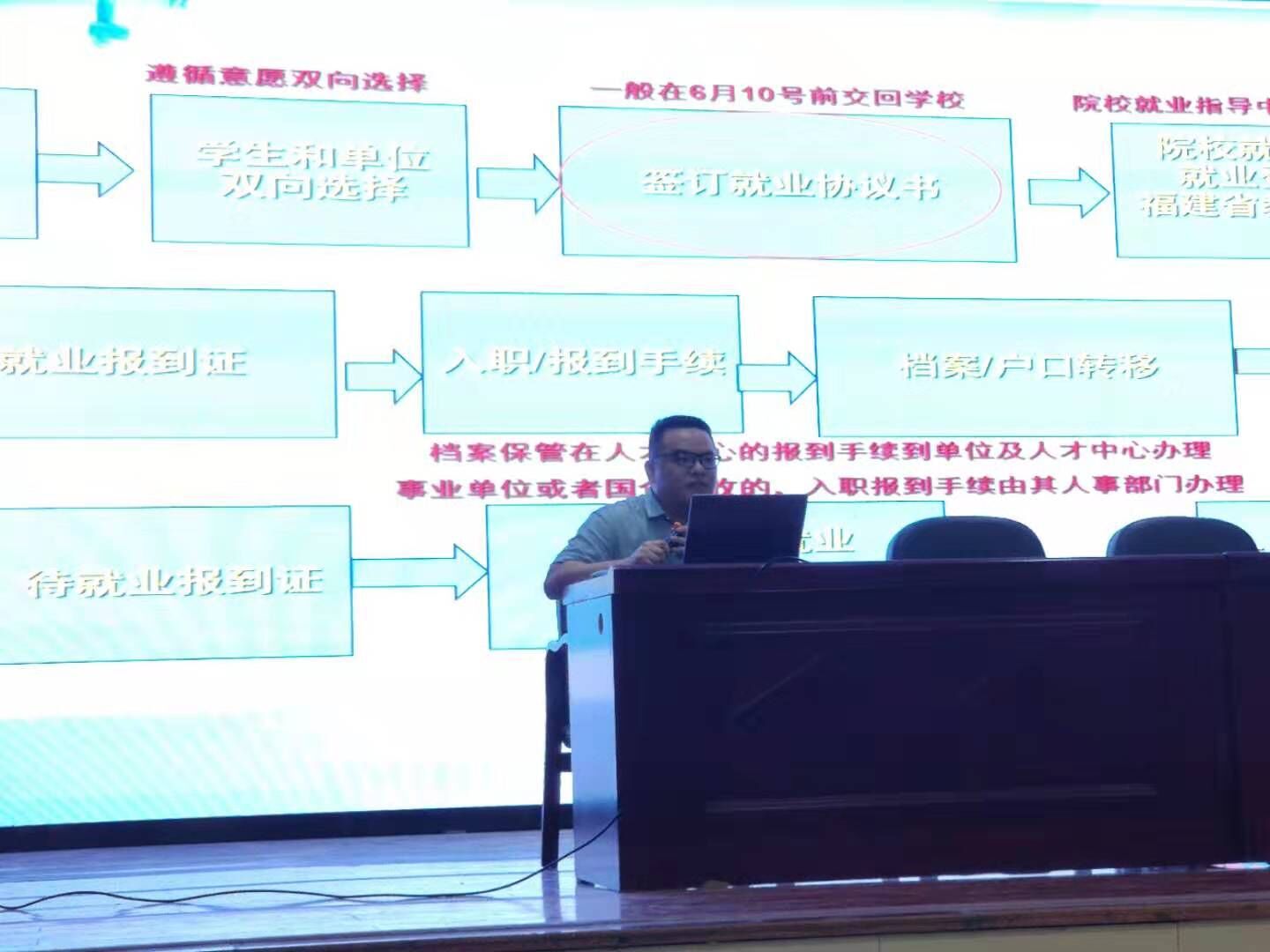为帮助我院2020届毕业生了解就业手续流程、明确就业政策形势、做好就业规划,2019年11月1日晚七点,我系特别邀请到福建建筑人才服务中心的业务主办毛宇超经理于三食堂四楼礼堂为2020届毕业生讲解毕业生就业政策的具体内容及注意事项,毕业班辅导员陈明峰老师以及我系毕业班全体同学参加了此次宣讲会。