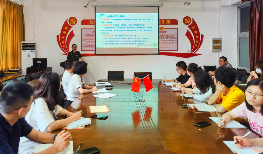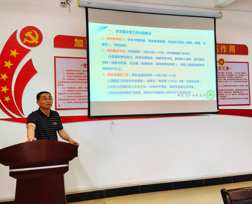 会上,林学系主任廖建国对本学期期末系工作内容要点、“双高”建设任务分解、近期工作的建设情况、系部建设情况四个方面进行详细介绍。林学系党总支副书记傅成杰强调毕业生顶岗实习、实习实训、实验室管理过程中要加强对学生安全教育。林学系副主任余燕华对毕业班补考工作、暑假课程安排、安全教育、期末监考方面进行再强调、再安排、再部署。
