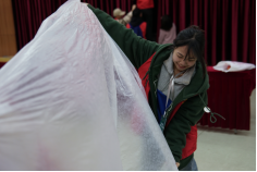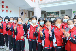 志愿者和小朋友们在横幅上签名