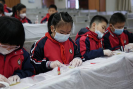 志愿者们指导小朋友们制作叶脉书签