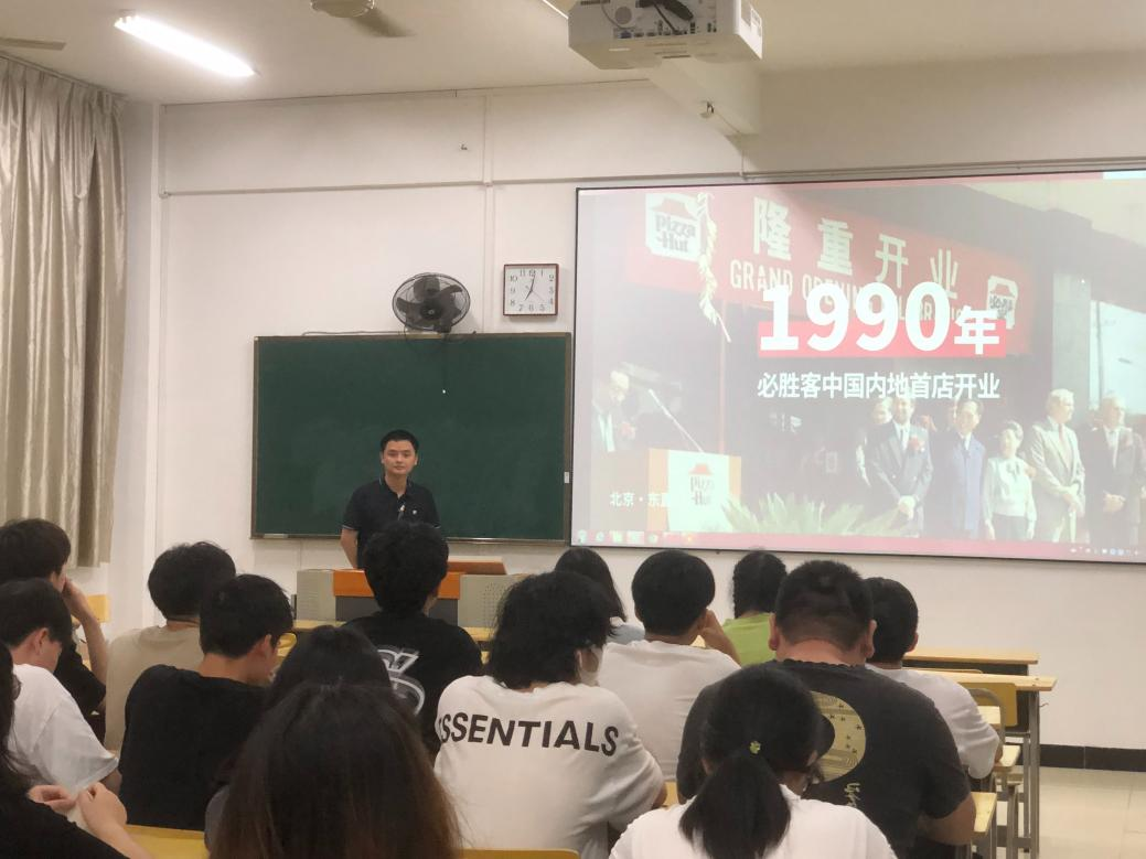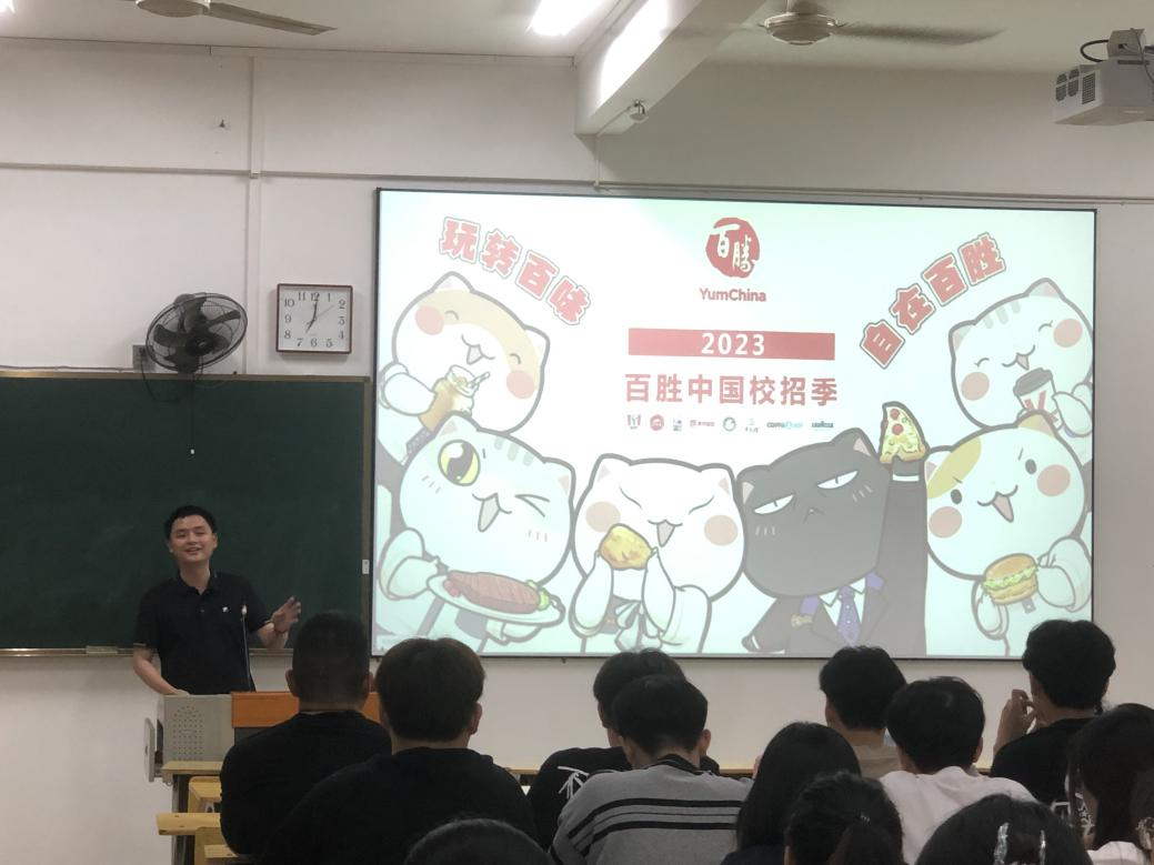 6月8日晚上,百胜餐饮(福州)有限公司在教学楼405举行2023年校园招聘会,食品检验检测技术和食品药品监督管理学生参加。招聘现场,百胜餐饮(福州)有限公司邹凯通过短视频及ppt的形式向学生们全方位介绍了百胜中国控股有限公司的公司规模、品牌家族、发展历史、公司文化、公司数据及近期荣誉,并详细的描述对于招牌岗位的工作职责、岗位要求、个人及职业发展和薪资福利。