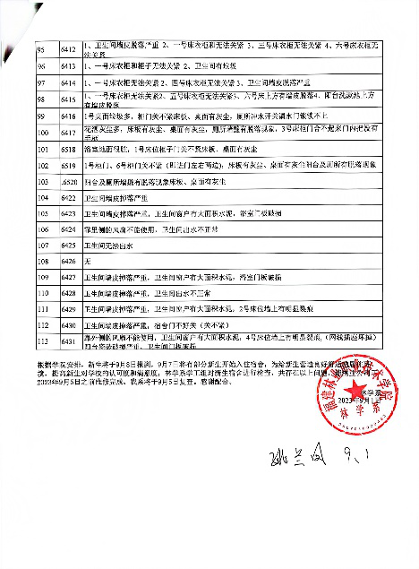 为落实落细学院第一次学生工作会议精神,切实做好林学系2023级新生入学及教育引导工作,帮助新生更好的适应大学校园生活,养成良好的习惯,扣好大学的第一粒“扣子”。林学系党总支积极响应,于8月31日分别召开林学系党总支迎新工作会、林学系2023-2024学年第一学期第二次学生工作会、2023级新生助导培训会等一系列会议,部署安排迎新工作,制定《林学系2023年迎新工作方案》。并在9月1日进行新生宿舍检查,将113间宿舍存在的问题一一列出清单,加盖公章后交给物业公司进行维修,确保迎新工作的顺利进行。