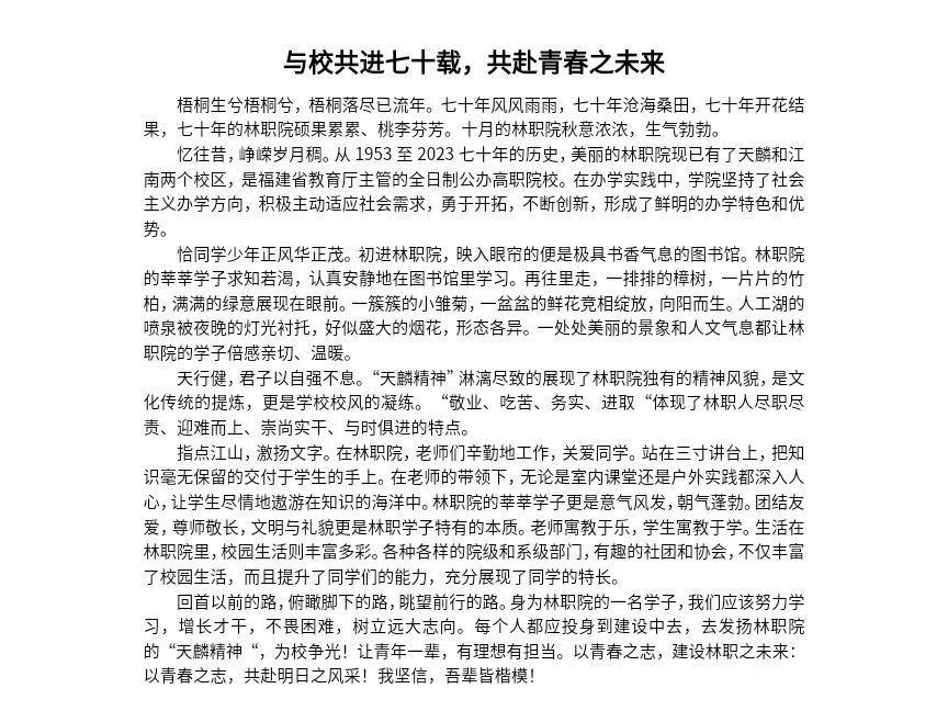 征文活动的主题将紧密围绕“我们的母校、我们的回忆、我们的未来”,鼓励参与者表达对学校七十年发展历程的独特见解、对学校精神的理解、对未来发展的展望,或是回顾自己的成长与学习经历。在培养写作能力和凝聚全校师生的热情的,共同庆祝这一特殊时刻。以下是本次比赛的获奖作品。