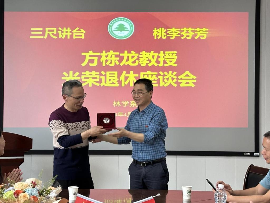 最后,廖建国主任感谢方教授积累的成功经验、树立的优秀榜样和传承的师道精神,祝愿方教授退休生活幸福美满!希望方教授一如既往地关注、关心和支持林学系的发展。