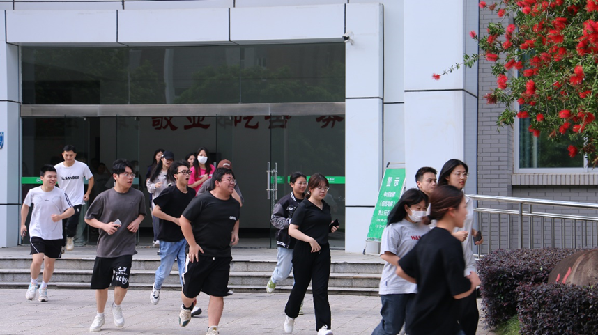 下午3:00时随着急促的警报声响起,全校进入模拟学校发火灾的情境中。应急演练开始,广播传来掩住口鼻、弯腰前行、有序、小跑疏散的指令,各班在班委和相关工作人员的有效组织下,大家井然有序并快速由安全通道撤离到图书馆。