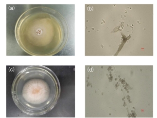 Fig. 1 Morphological characteristics of pathogenic fungi. (a) Cultures of strain TF1 on PDA. (b) The mycelium and conidia of strain TF1. (c) Cultures of strain TF2 on PDA. (d) The mycelium and conidia of strain TF2.