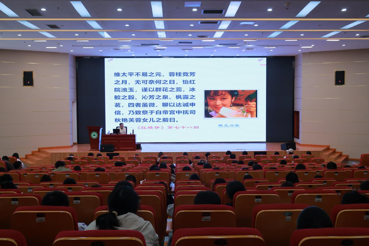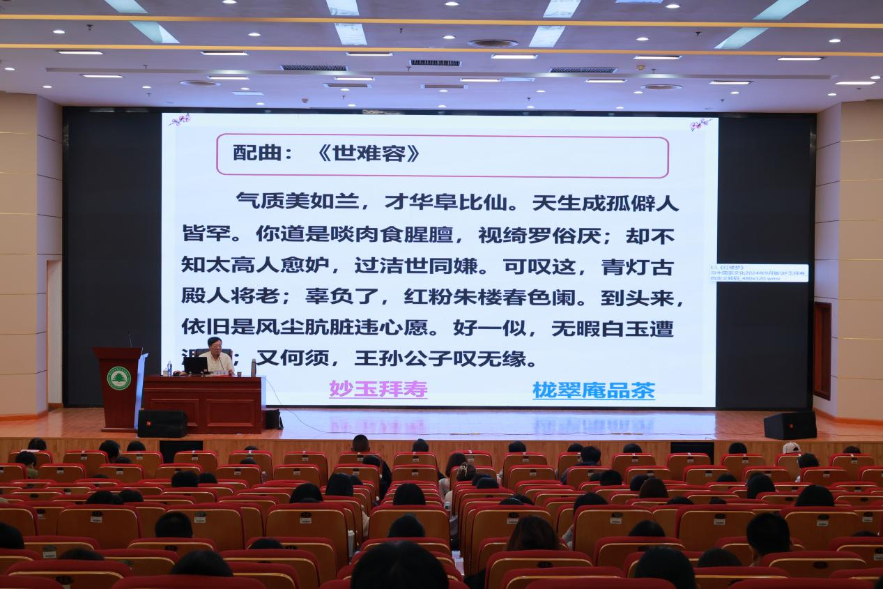 王人恩教授精准把握《红楼梦》和中国茶文化之间的深刻联系,以渊博的学识和深厚的文化底蕴,引领听众步入《红楼梦》如诗如画的世界,细致赏析《红楼梦》中写到的茶事片段,如茶名、茶具、茶礼、茶俗、茶水、茶食、茶诗等,深度解读茶文化对烘托人物性格的作用。为让现场师生能直观地理解《红楼梦》中的茶文化,除配读原文的描写和讲解外,教授还为大家播放了87版电视剧《红楼梦》中与茶相关的经典片段,从《红楼梦》中的茶叙事与茶描写等方面做了直观阐述,让现场师生仿佛置身于曲径通幽的“大观园”之中。