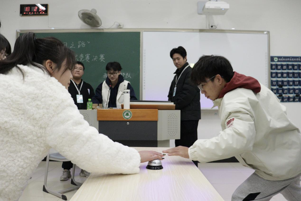 随后便进入紧张刺激的抢答环节,同学们蓄势待发,集中注意力紧盯抢答铃,都希望在“开始抢答”的声音出现后以最快的速度拍铃。速度与激情,智慧与勇气,究竟谁才是这场比赛最后的赢家?