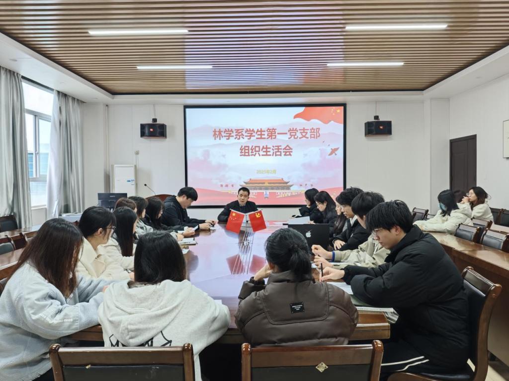 为深入学习贯彻习近平新时代中国特色社会主义思想,巩固深化党纪学习教育成果,综合发挥党的纪律教育约束、保障激励作用,为进一步全面深化改革、推进中国式现代化提供坚强纪律保证,2025年2月21日下午,林学系学生第一党支部在林学系会议室召开2024年度组织生活会,并开展民主评议党员,本次会议由支部书记叶知勇老师主持,支部全体师生党员参会。