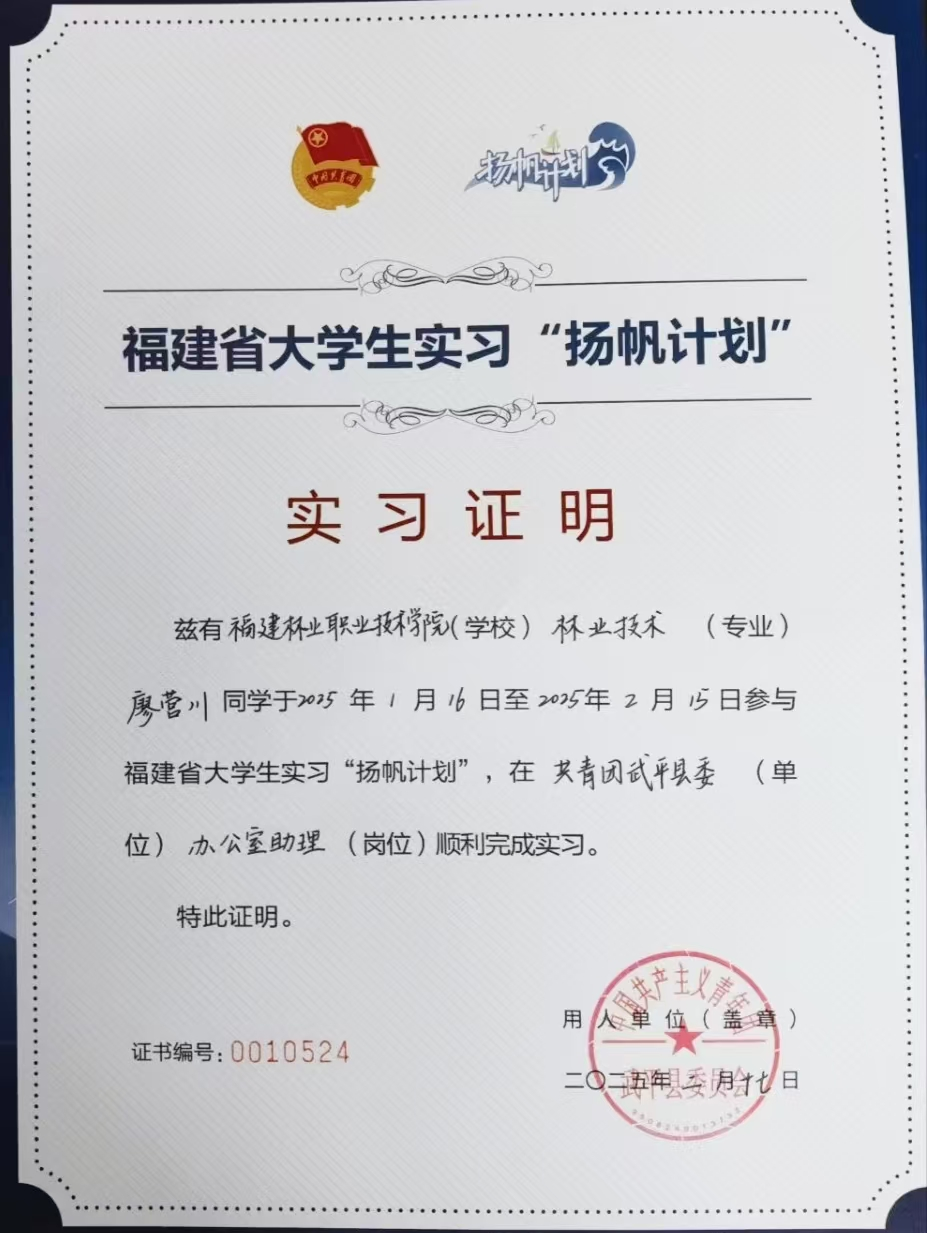 为深入学习贯彻习近平新时代中国特色社会主义思想,加强自身综合实践能力,锤炼顽强奋斗品格。福建林业职业技术学院林学系林业技术2402班廖营川于2025年寒假期间积极参与各类社会实践活动,用自己的实际行动诠释了当代青年的责任与担当。
