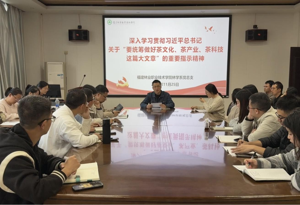 为深入学习贯彻习近平总书记关于“要统筹做好茶文化、茶产业、茶科技这篇大文章”的重要指示精神,林学系党总支于11月25日在林学楼会议室召开专题学习会,会议由党总支书记傅成杰主持,系部教师参加学习。