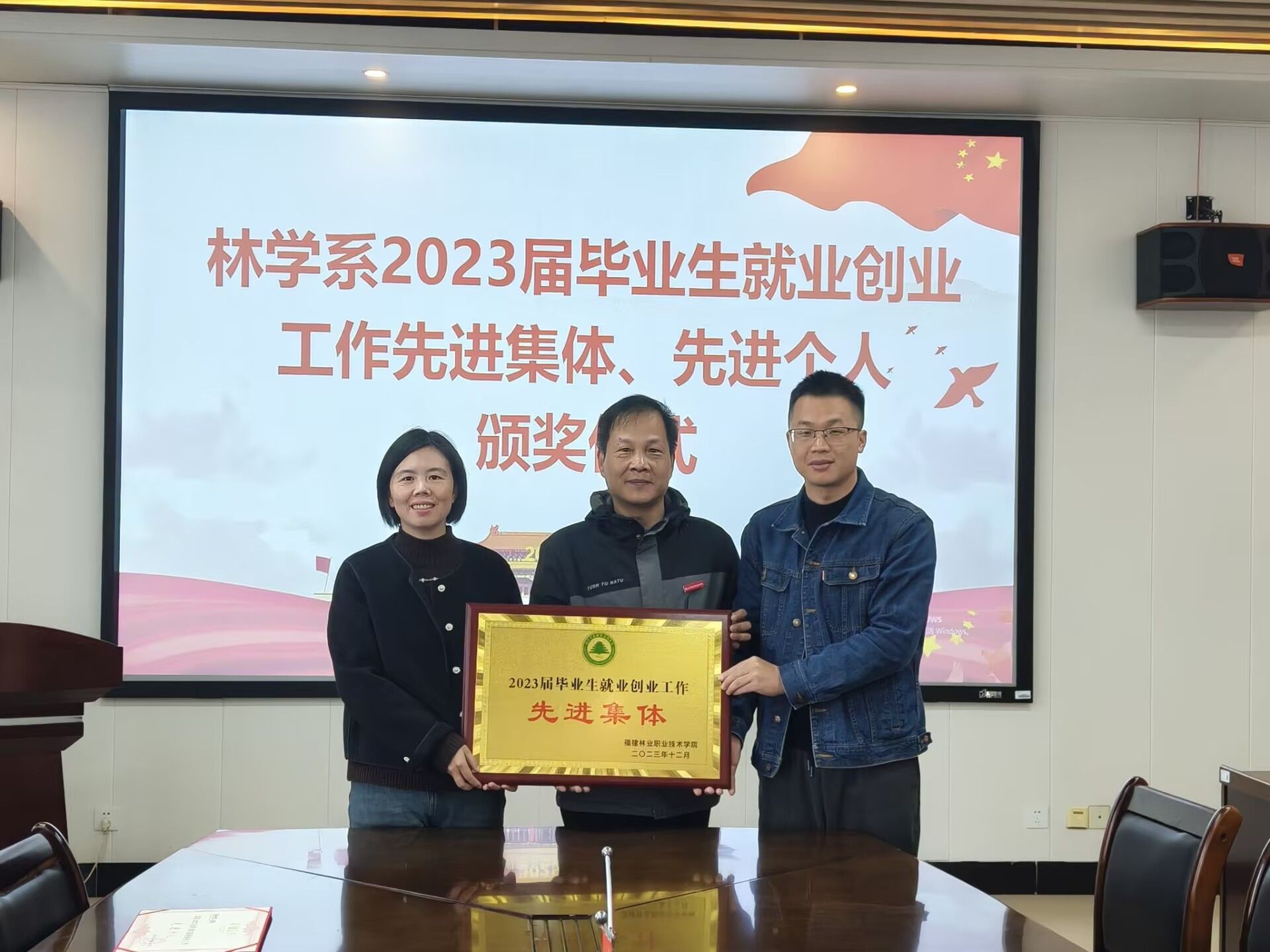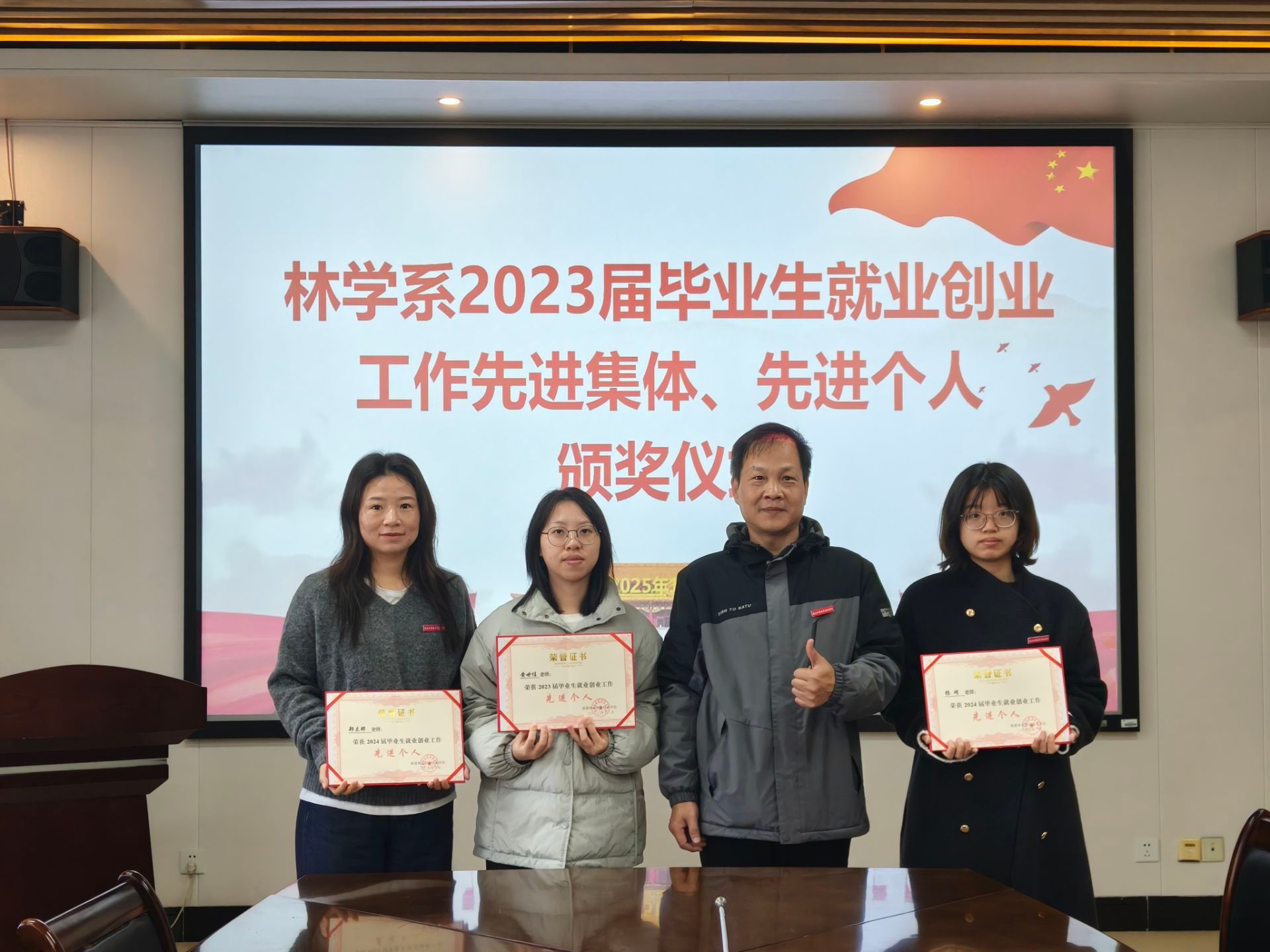 12月9日上午,学院党委委员、副院长黄晖,招就处处长陈莉以及招就处副处长黄庆斌一行前往林学系,为2023届毕业生就业创业工作先进集体、先进个人颁奖。颁奖仪式在林学系会议室举行,林学系学工组全体成员参加。
