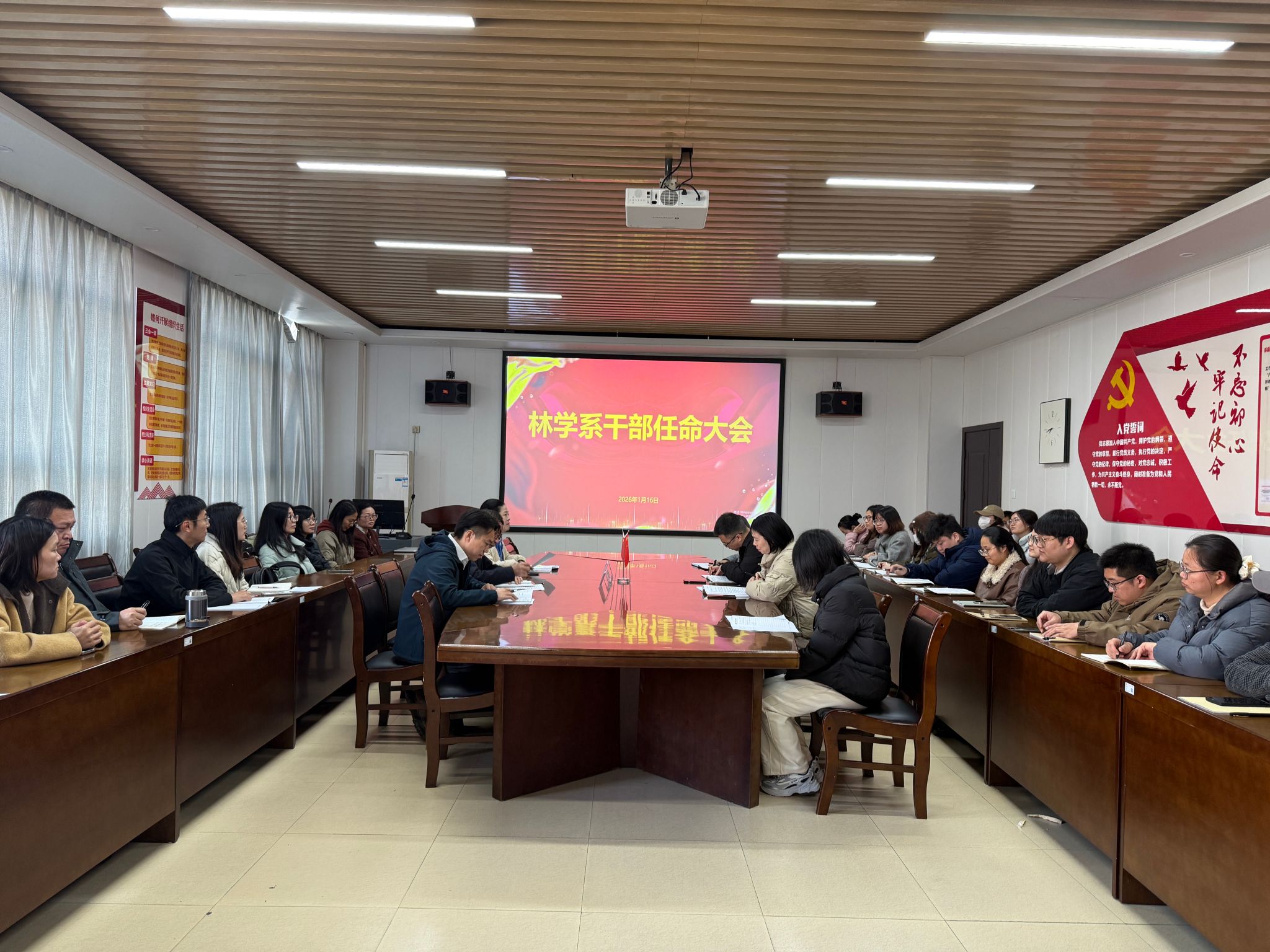 1月16日上午,林学系在四楼会议室召开干部任命大会,宣布干部任命决定。学院党委委员、副院长李肇锋,组织部(统战部)部长李霞,林学系党政领导班子、全体行政坐班人员及专任教师代表参加会议,会议由林学系党总支副书记余燕华(主持工作)主持。