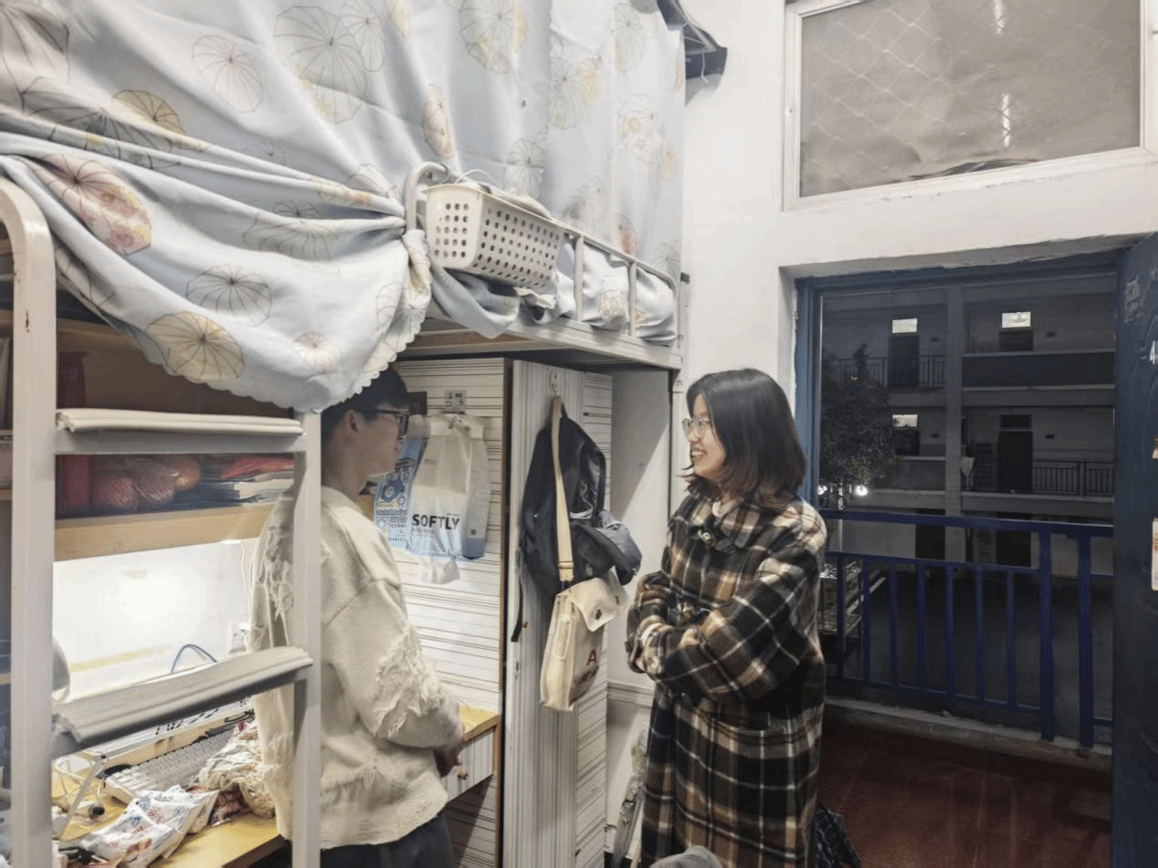 每到一间宿舍,老师们都带着亲切的笑容,与同学们围坐在一起亲切交谈,细致询问大家寒假返乡路途是否顺利、假期生活是否充实,认真倾听同学们分享寒假期间的所见所闻、实践经历与成长感悟,耐心了解同学们返校后的住宿适应情况、生活需求以及新学期的学习规划。