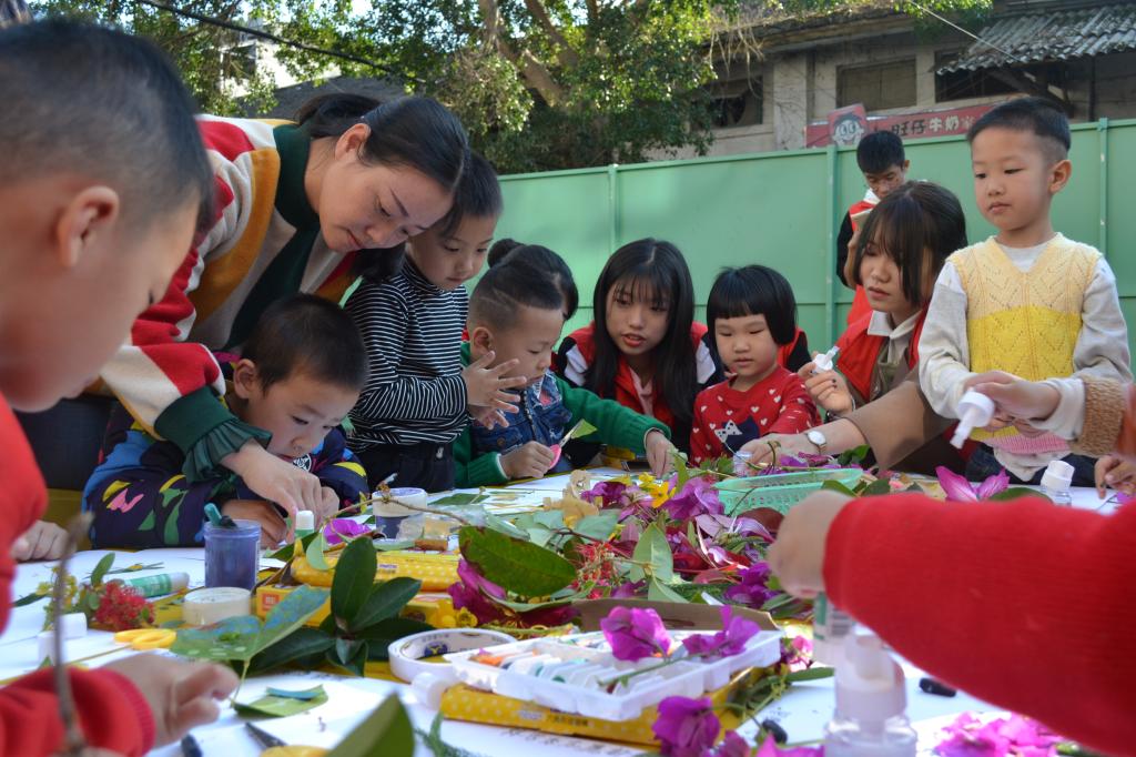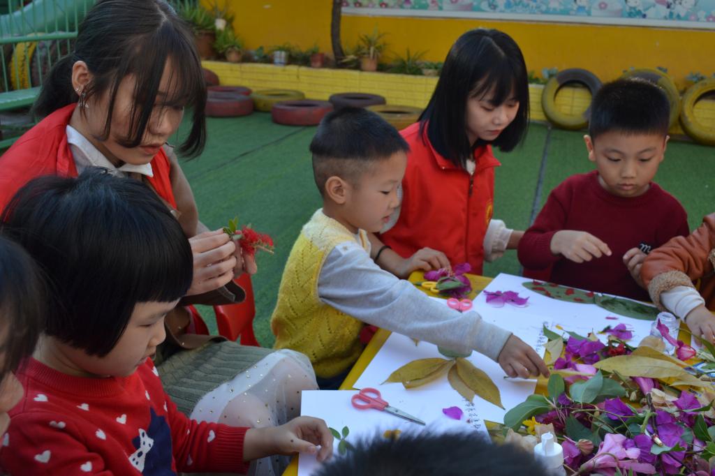 为了能让小朋友与大自然更了解美丽的大自然,与花草有更亲密的接触,志愿者们一周前就在校园四处收集形状各异、色彩鲜丽的植物标本。下午,志愿者一行来到夏道春曦幼儿园。在给小朋友们介绍了一些常见的植物,展示了草木缘协会的同学作品后,志愿者们拿出了早已准备好的植物标本,孩子们跃跃欲试,纷纷拿起工具,迫不及待的动手设计起来,志愿者们手把手指导孩子,开始了创作之旅。孩子们聚精会神,充分发挥想象力和创造力,在一张张白纸上留下“绿色画作”,成为形态各异的风景图。孩子们那专心致志的样子,宛如一个个小设计师。