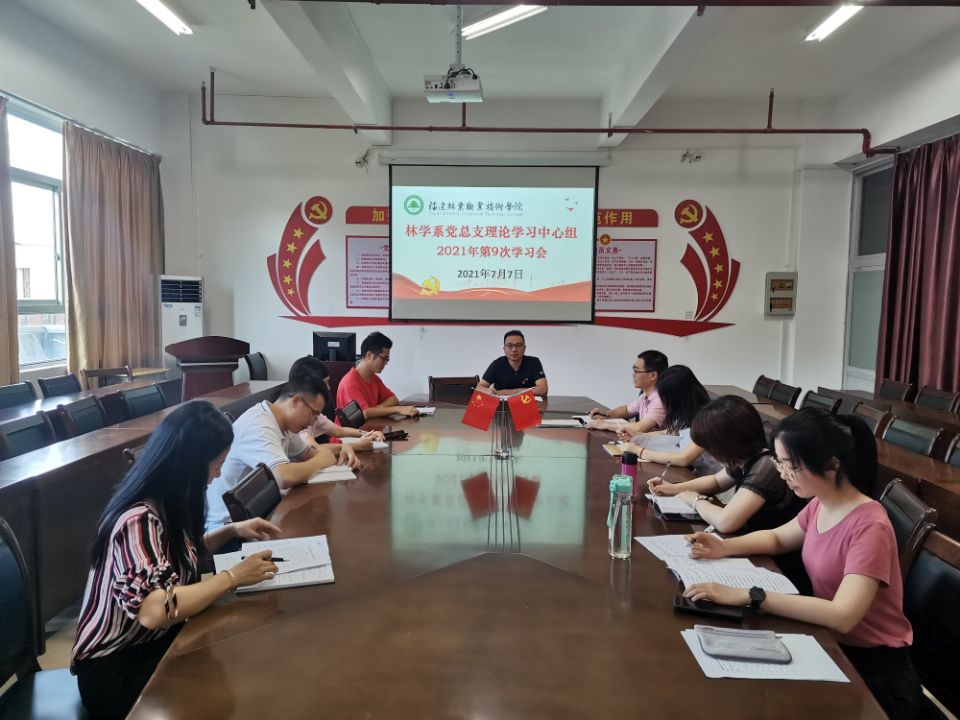 7月7日下午,林学系党总支在实训一4楼中间会议室组织召开了党史学习教育专题学习暨党组理论学习中心组第2021—9次集体学习研讨。林学系党总支书记徐洪领学,党史学习教育校内巡查指导组组长、院组织部部长李霞现场巡听指导。