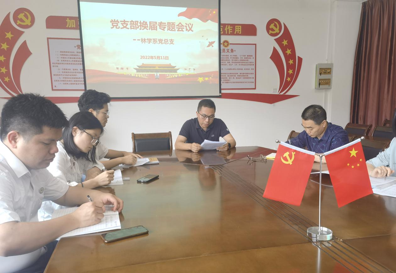 为做好基层党支部换届选举工作,林学系党总支于2022年5月11日召开党支部换届选举工作专题会议。出席本次会议的有党总支书记徐洪、系主任廖建国、其他总支成员及各党支部书记、支委等。会议由徐洪同志主持。